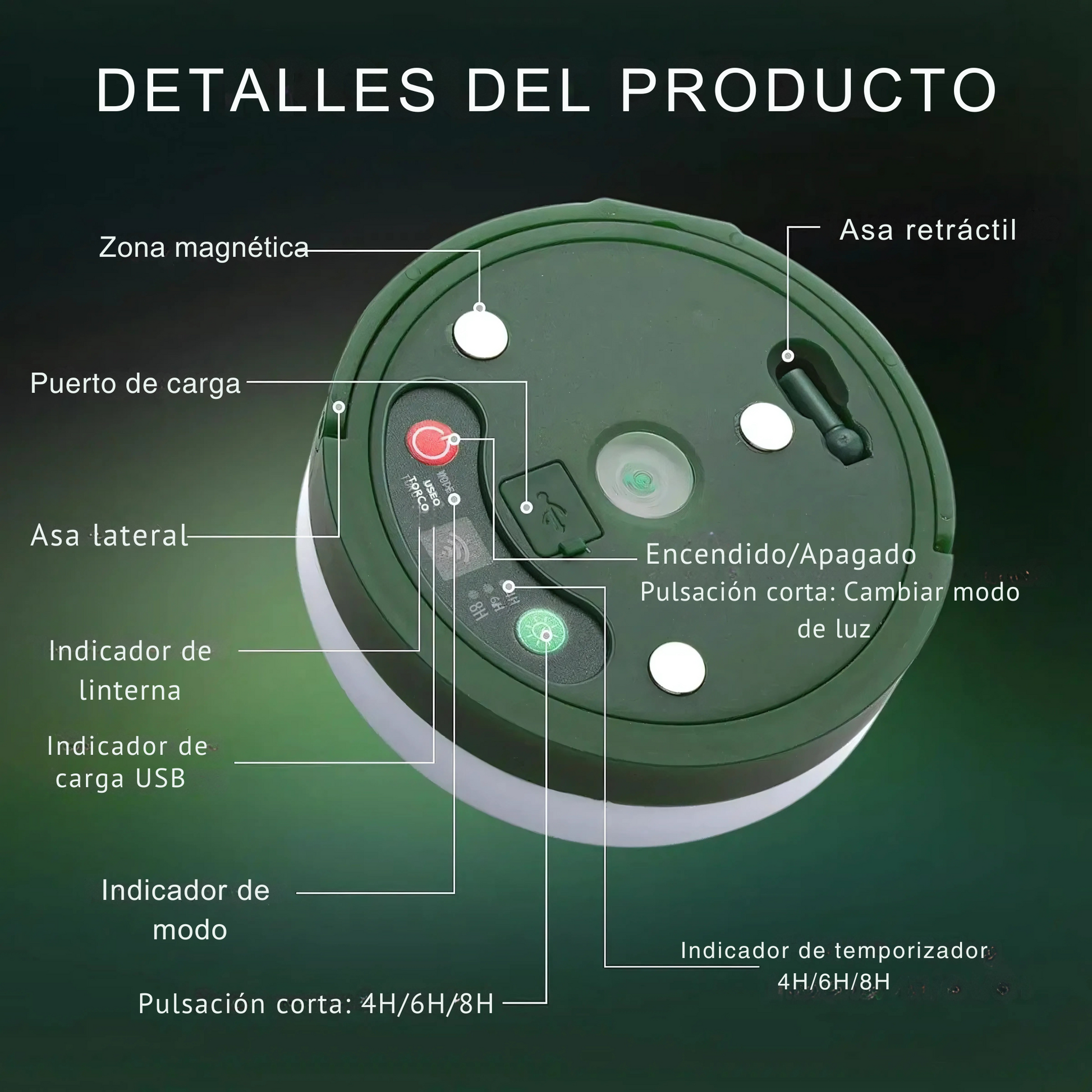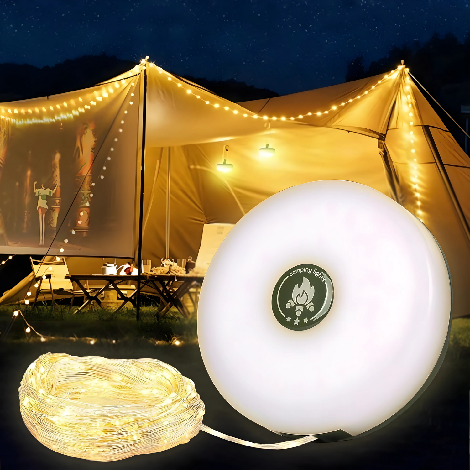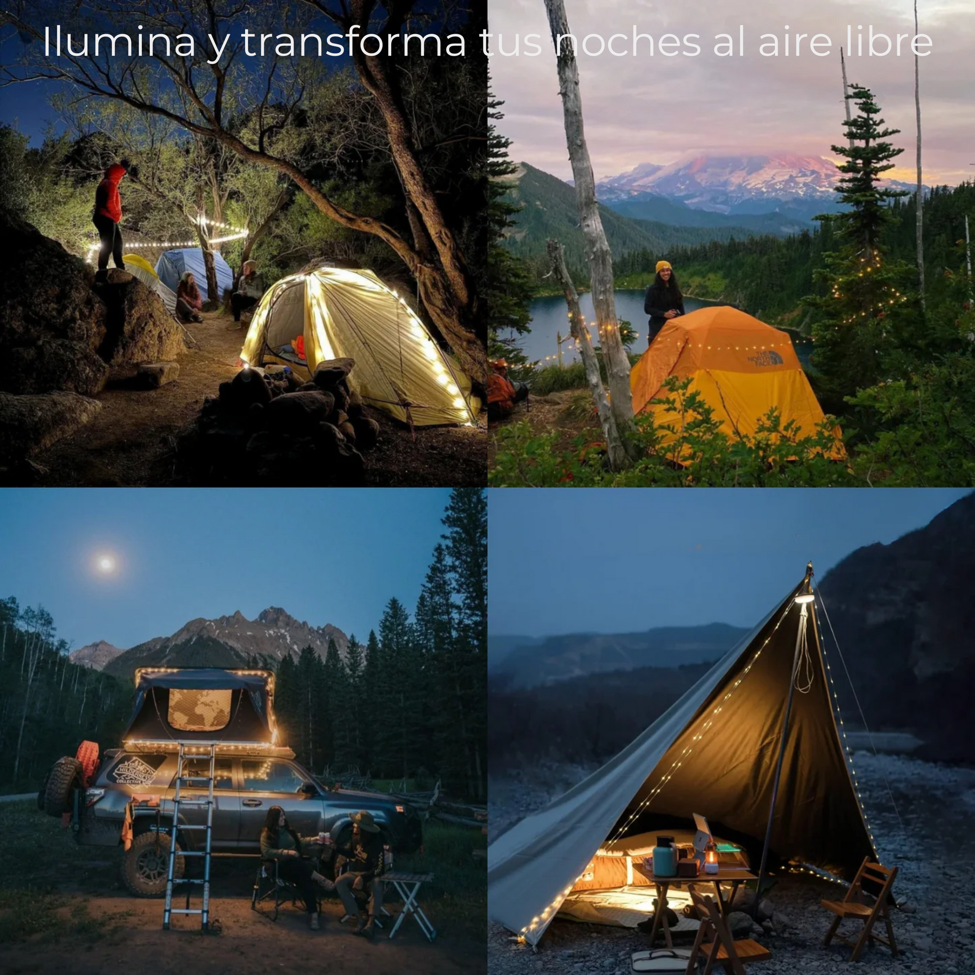 🔥Compacta, versátil y lista para cualquier aventura. Ilumina tu campamento en segundos con una luz 4 en 1 que funciona como linterna, farol, guirnalda LED y cargador portátil.