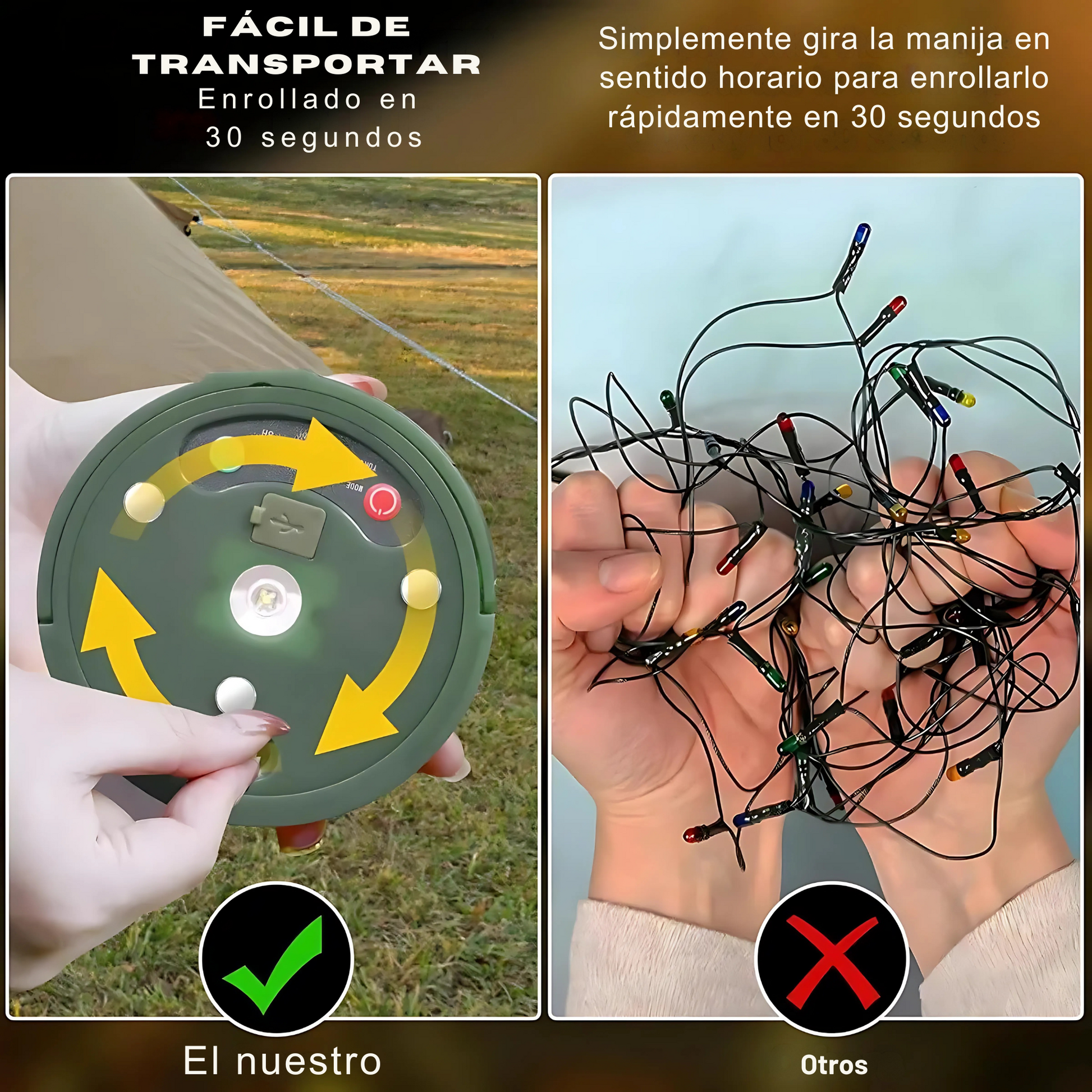 Con la Luz Nómada™ enrollas el cable en menos de 30 segundos gracias a su sistema con manija giratoria.